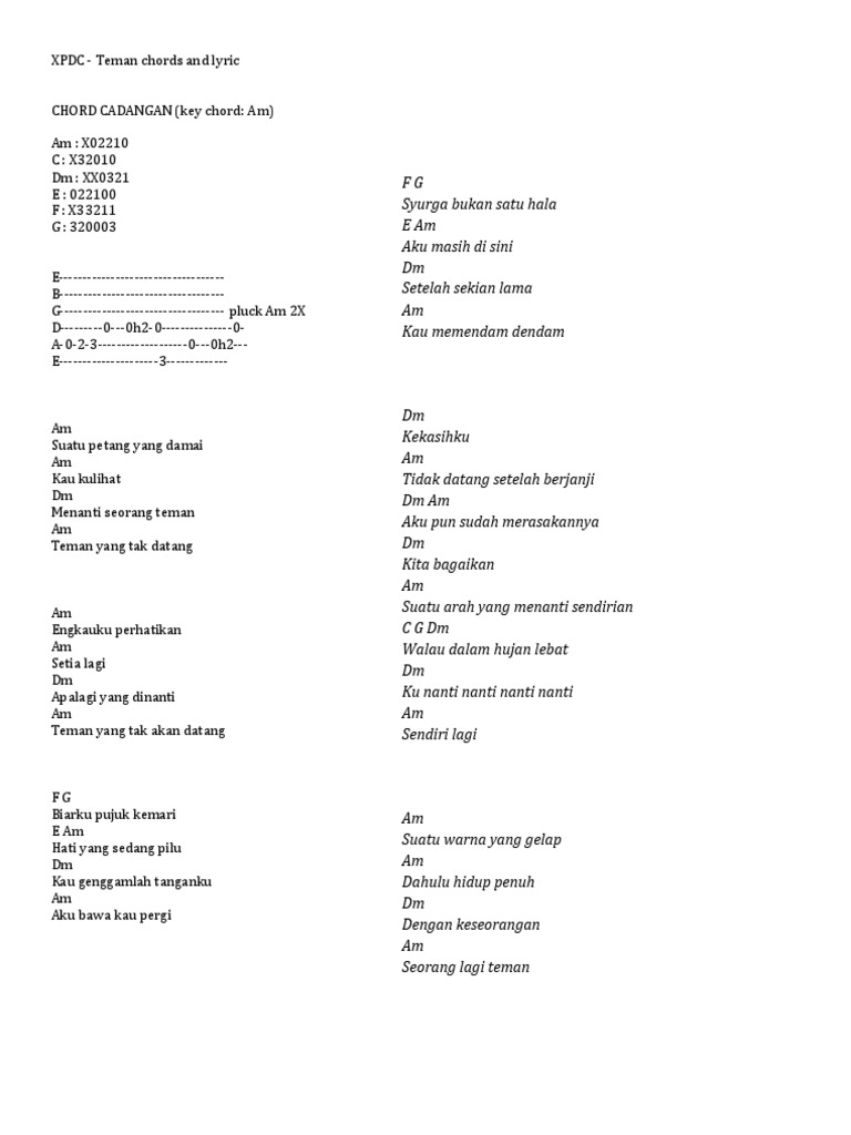 . 29 Lirik Lagu Dan Kunci Gitar Xpdc. Silahkan lihat diagram kord gitar dengan cara hover atau sentuh kunci gitar di atas lirik lagu. Antara salah satu lagu popular kumpulan XPDC.